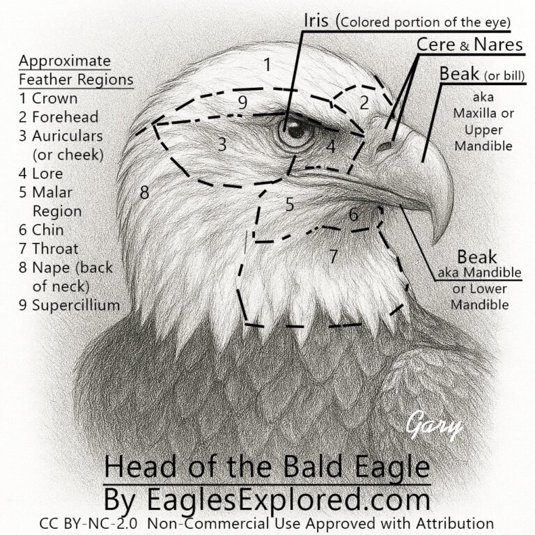This anatomical diagram of the Bald Eagle’s head highlights key feather regions and structural features referenced in McCollough’s 1989 plumage study. While McCollough sometimes used accessible terms like “cheek,” “forehead,” and “eye stripe” to describe variation across plumage stages, this illustration offers a more detailed map of the underlying anatomy—including the auriculars, malars, crown, and throat. By visualizing these regions, viewers can better understand how flecking, shading, and molt-phase traits appear in different plumage classes. The diagram serves as both a reference and an invitation: to look closer, ask questions, and engage with the archive as a living resource. (Illustration Credit: EaglesExplored.com CC-BY-NC 2.0)